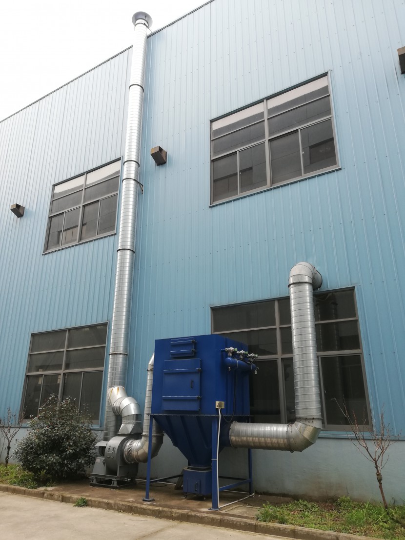 除塵裝置采用市面上主流的耐阻燃濾筒式焊煙除塵器,濾材采用防火阻燃材質(zhì),濾筒垂直設(shè)計(jì)安裝,維護(hù)方便;,總風(fēng)量設(shè)計(jì)為8000m3/h,壓損設(shè)計(jì)為2500pa,采用11KW離心風(fēng)機(jī)做為動(dòng)力源。設(shè)計(jì)有移動(dòng)式收集桶,方便灰塵收集和清理,煙囪按照環(huán)評(píng)標(biāo)準(zhǔn)設(shè)計(jì)高出屋頂2m左右,總高度保證在15m。工業(yè)粉塵治理中的濾筒選擇是整個(gè)系統(tǒng)的核心關(guān)鍵,包括數(shù)量和材質(zhì)等等;