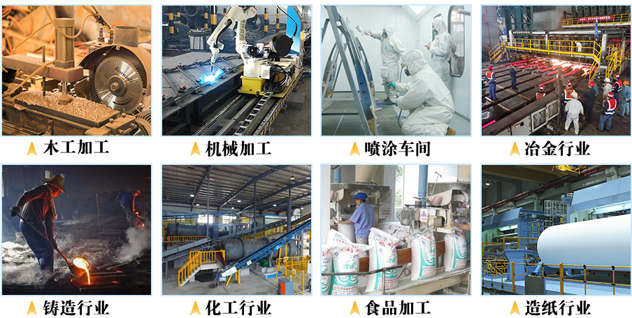 焊接、顏料、塑料、電子、輪胎、鋼板預處理、粉煤灰、陶瓷、煉化、橡膠、水泥、鈦白粉、倉頂物料等揚塵場合。