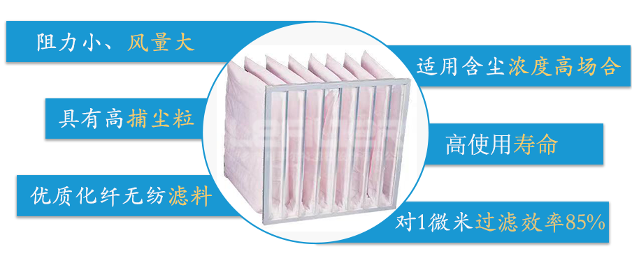 袋式中效過濾器主要用于中央空調和集中送風系統,可用于空調系統的中級過濾,以保護系統中下一級過濾器和系統本身,在對空氣凈化潔凈度要求不嚴格的場所,經中效過濾器處理后的空氣可直接送至用戶。鋁框袋式過濾器采用優質合成纖維或進口玻璃纖維為濾材,鋁合金型材外框,內部噴塑冷拔絲支撐架。