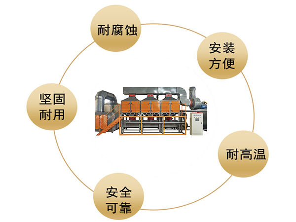 催化燃燒設備工作原理,在工業生產過程中,排放的有機尾氣通過引風機進入設備的旋轉閥,通過選轉閥將進口氣體和出口氣體完全分開。氣體首先通過陶瓷材料填充層(底層)預熱后發生熱量的儲備和熱交換,其溫度幾乎達到催化層(中層)進行催化氧化所設定的溫度,這時其中部分污染物氧化分解;廢氣繼續通過加熱區(上層,可采用電加熱方式或天然氣加熱方式)升溫,并維持在設定溫度;其再進入催化層完成催化氧化反應,即反應生成CO2和H2O,并釋放大量的熱量,以達到預期的處理效果。經催化燃燒設備后的氣體進入其它的陶瓷填充層,回收熱能后通過旋轉閥排放到大氣中,凈化后排氣溫度僅略高于廢氣處理前的溫度,系統連續運轉、自動切換,通過旋轉閥工作,所有的陶瓷填充層均完成加熱、冷卻、凈化的循環步驟,熱量得以回收。