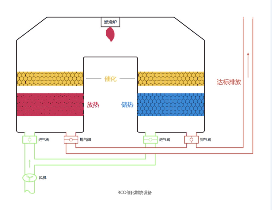 催化燃燒設(shè)備工作原理,在工業(yè)生產(chǎn)過程中,排放的有機(jī)尾氣通過引風(fēng)機(jī)進(jìn)入設(shè)備的旋轉(zhuǎn)閥,通過選轉(zhuǎn)閥將進(jìn)口氣體和出口氣體完全分開。氣體首先通過陶瓷材料填充層(底層)預(yù)熱后發(fā)生熱量的儲(chǔ)備和熱交換,其溫度幾乎達(dá)到催化層(中層)進(jìn)行催化氧化所設(shè)定的溫度,這時(shí)其中部分污染物氧化分解;廢氣繼續(xù)通過加熱區(qū)(上層,可采用電加熱方式或天然氣加熱方式)升溫,并維持在設(shè)定溫度;其再進(jìn)入催化層完成催化氧化反應(yīng),即反應(yīng)生成CO2和H2O,并釋放大量的熱量,以達(dá)到預(yù)期的處理效果。