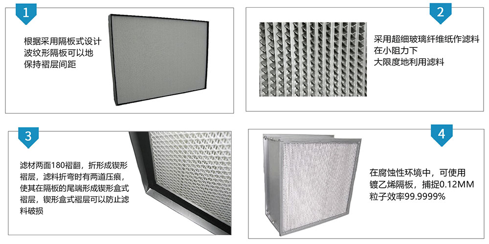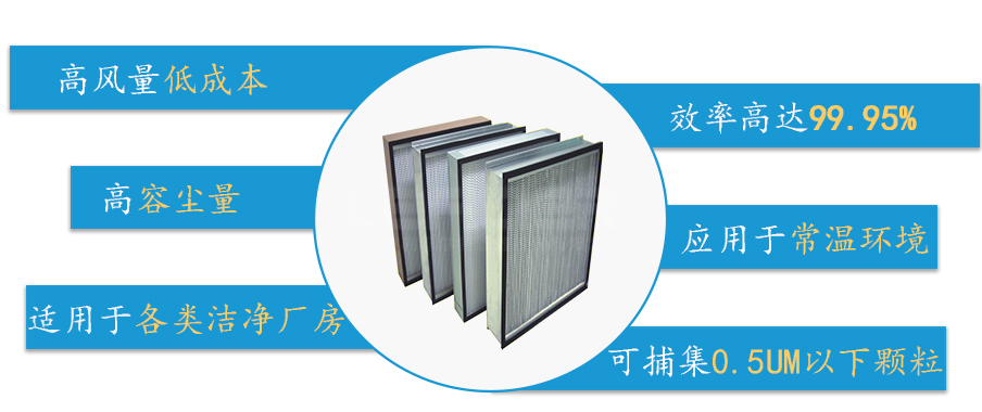 亞高效空氣過濾器具有效率較高,容塵量大、阻力低、密封性能好等優點。可做為潔凈室、超凈廠房的終端過濾裝置,也可做為高級潔凈室的中間過濾器??諝膺^濾器可在工作溫度小于60℃、相對濕度低于80%的空氣中作過濾用。本過濾器以木質或金屬鍍鋅鋼板做外框,以80%的棉纖維和20%的無堿超細玻璃棉混合纖維紙作濾料,總裝時濾紙沿波形分隔紙板往返多次,并精選特殊膠粘劑封裝而成。