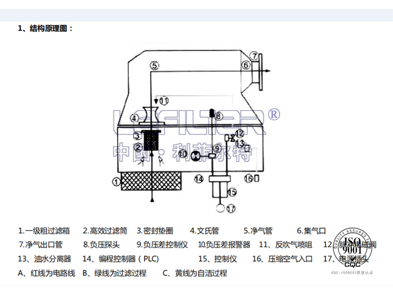 自潔過(guò)程: 含塵空氣氣經(jīng)過(guò)濾后,塵埃被吸附在高效過(guò)濾筒上,由 PLC 按設(shè)定時(shí)間順序進(jìn)行反吹自潔過(guò)程, 當(dāng)阻損值超過(guò) 600 帕?xí)r,由 PLC 按差壓順序控制反吹自潔過(guò)程(反吹時(shí)間為 0.1-0.2 秒)。其它高效過(guò)濾筒照常工作,塵埃被反吹自潔下來(lái)。