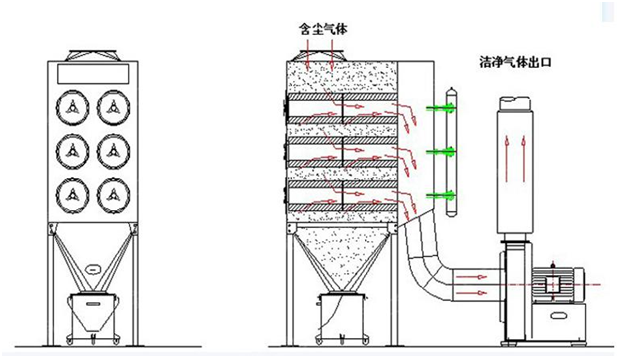 如圖所示,粉塵通過吸入口進入集塵器后,首先碰到進風口中間的斜隔擋板,對進入的氣體起到了擾流的作用,改變粉塵的運行方向,同時氣流速度變慢,由于重力沉降作用,使氣體中粗顆粒粉塵直接落入灰斗,起到預除塵的作用。進入灰斗的氣流隨后向上流動,經過濾筒,粉塵被捕集在過濾筒的表面。凈化后的氣體進入濾筒室上部的清潔室,匯集到排氣口排出。