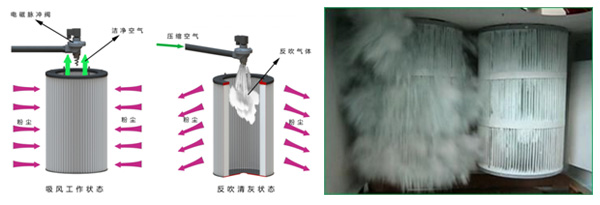 每次噴吹清灰在0.1~0.3S左右完成,就是這一瞬間噴出的高壓空氣起到良好的清灰效果??諝庖愿叩牧魉龠M入過濾筒,使得過濾筒急劇膨脹,引起一次沖擊振動,使附在過濾筒的粉塵被抖落,濾料表面吸附的微塵在氣流作用下被抖落至集塵斗中。脈沖噴吹氣壓為0.4~0.6MPa,且運行中須保持恒定不變的供氣量。