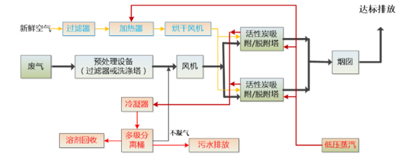 脫附過程:活性炭使用一段時間后處于飽和狀態,此時需對活性炭進行再生處理,脫附再生選用加溫解析法,將高溫蒸汽自塔底噴入罐內將有機物從活性炭中剝離,
