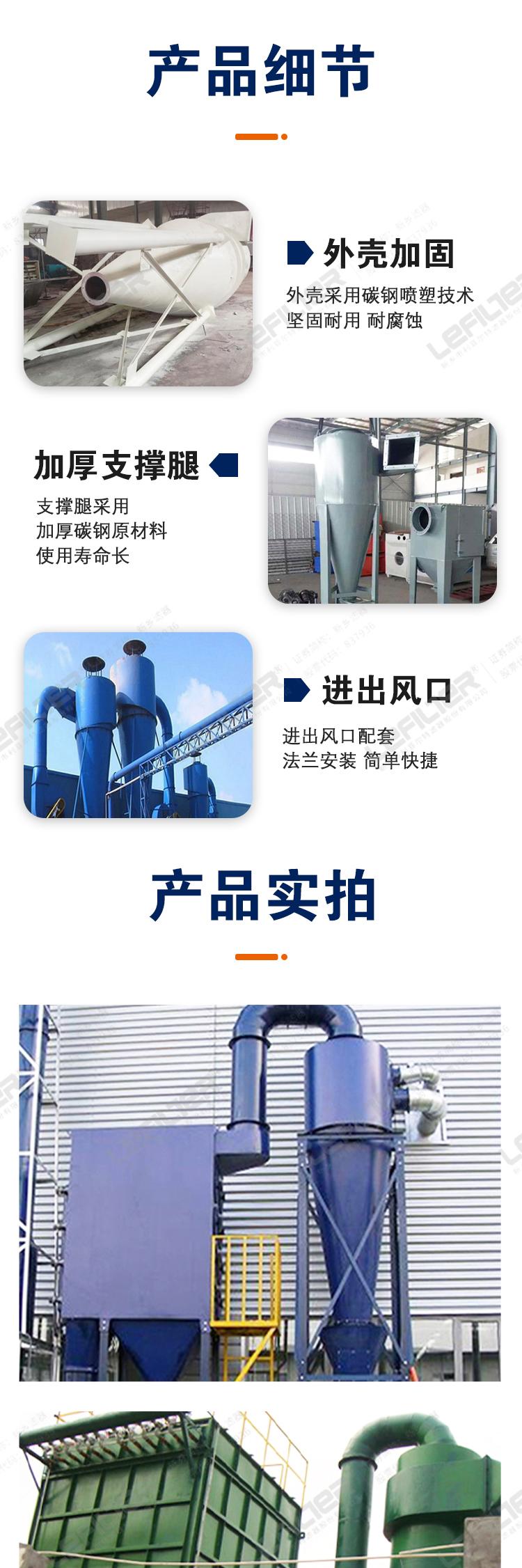 旋風除塵器是一種利用旋轉氣流產生離心力使煙塵顆粒從氣體中分離出來的設備。它的特點是結構簡單,體積較小,價格實惠,方便操作,維修簡單。動力消耗不大,適應高溫氣體。但旋風除塵器只適用于收集大于10μm的粉塵,對于小于5μm的微粒捕集效率較低,收塵效率大約在60%-90%。