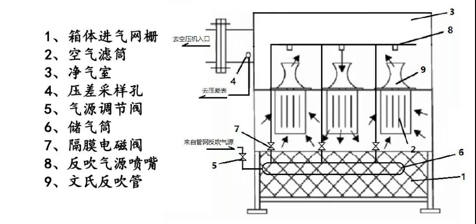 自潔過程: 含塵空氣氣經(jīng)過濾后,塵埃被吸附在高效過濾筒上,由 PLC 按設定時間順序進行反吹自潔過程, 當阻損值超過 600 帕時,由 PLC 按差壓順序控制反吹自潔過程(反吹時間為 0.1-0.2 秒)。其它高效過濾筒照常工作,塵埃被反吹自潔下來。